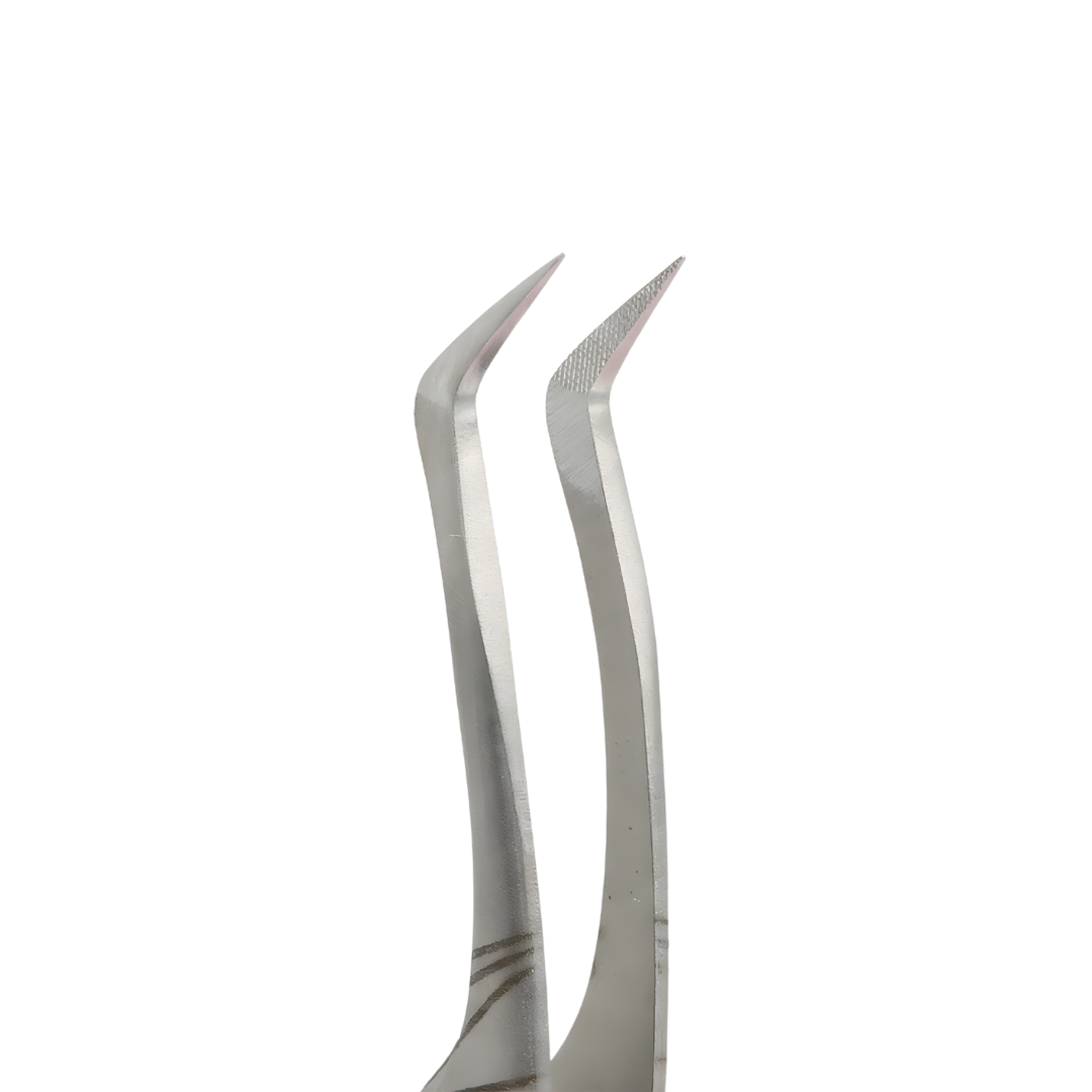 Featuring a beautifully engineered crescent-shaped curvature, these tweezers sit naturally in the hand, creating a lighter, more relaxed grip compared to traditional angled tweezers. The result is better control, reduced hand tension, and smoother movements throughout your set.